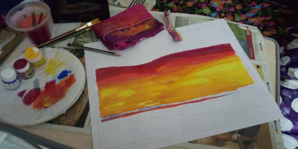 First I used yellow and gave few strokes then I added small amount of orange to it and made few more strokes. Make sure that you make a clear distinction in the color layers. As you may have noticed the sky during sunset, the colors do not jump from one to another. There a clear difference in the intensity. Visualize that and give the strokes.
