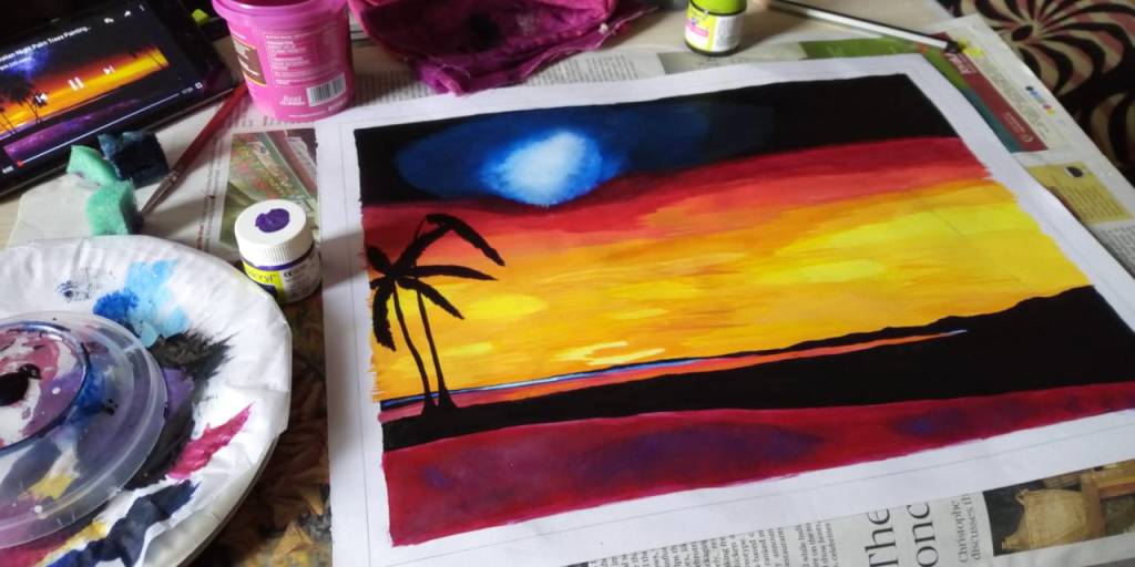 A canvas (preferably) or a chart paper (size you prefer, can either be a full size chart or one-fourth of it), acrylics paints- crimson red, yellow, orange, white, navy blue, dark green, black, pink and magenta- paint brushes (including a brush of size marked 0), a palette (to mix colors) or here I used a throwaway plate, a glass or cup with water to rinse your brush and a piece of cloth to clean your brush.