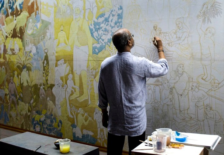 Once I was asked to do mural painting at a church. For doing the murals, I read the Bible for six months because I cannot jump into conclusions as I am a Hindu. So I spend time reading and understanding each character. My work in that church was the first in 400 years in the field of murals. While drawing the murals, we used to have discussions with the church people. But I had my perspective of connecting things to nature. For example, while drawing ‘path of crucification’ there is a situation when Jesus is undressed by evil people. What I did was, I drew a green young tree splitting apart and fire burning between those parts and green leaves behind Jesus.
